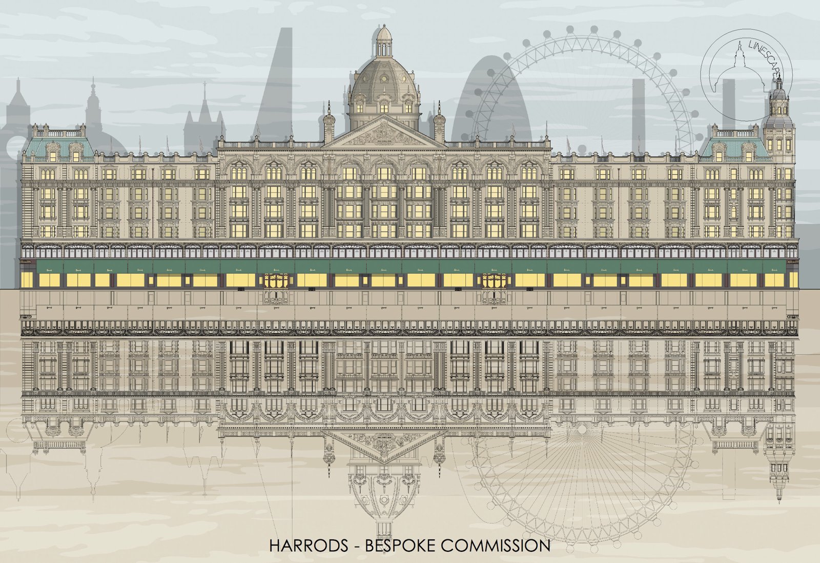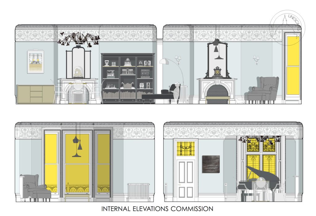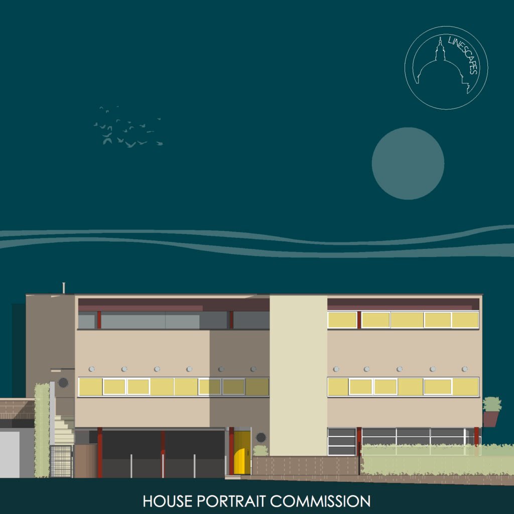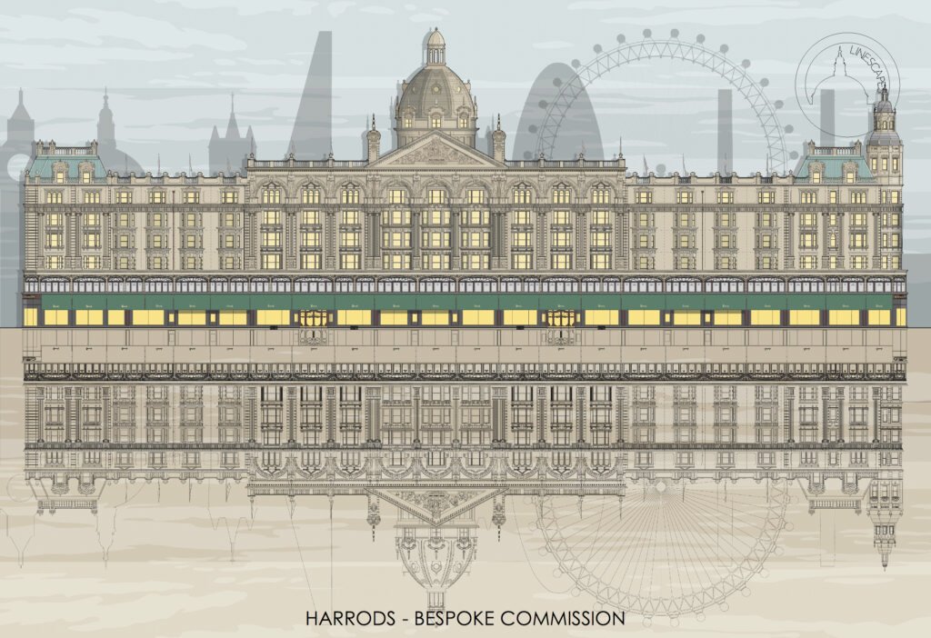 Previous bespoke commissions include creating over a hundred private house portraits, and illustrations for Sir John Soane’s Museum, Canterbury Cathedral, Chatsworth House, Harrods, Royal Opera House, Brighton Royal Pavilion and Abbey Road Studios among many others.