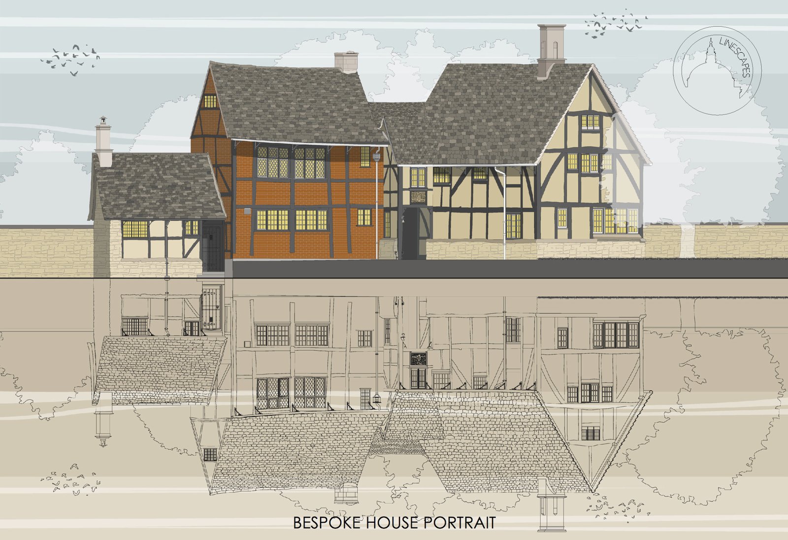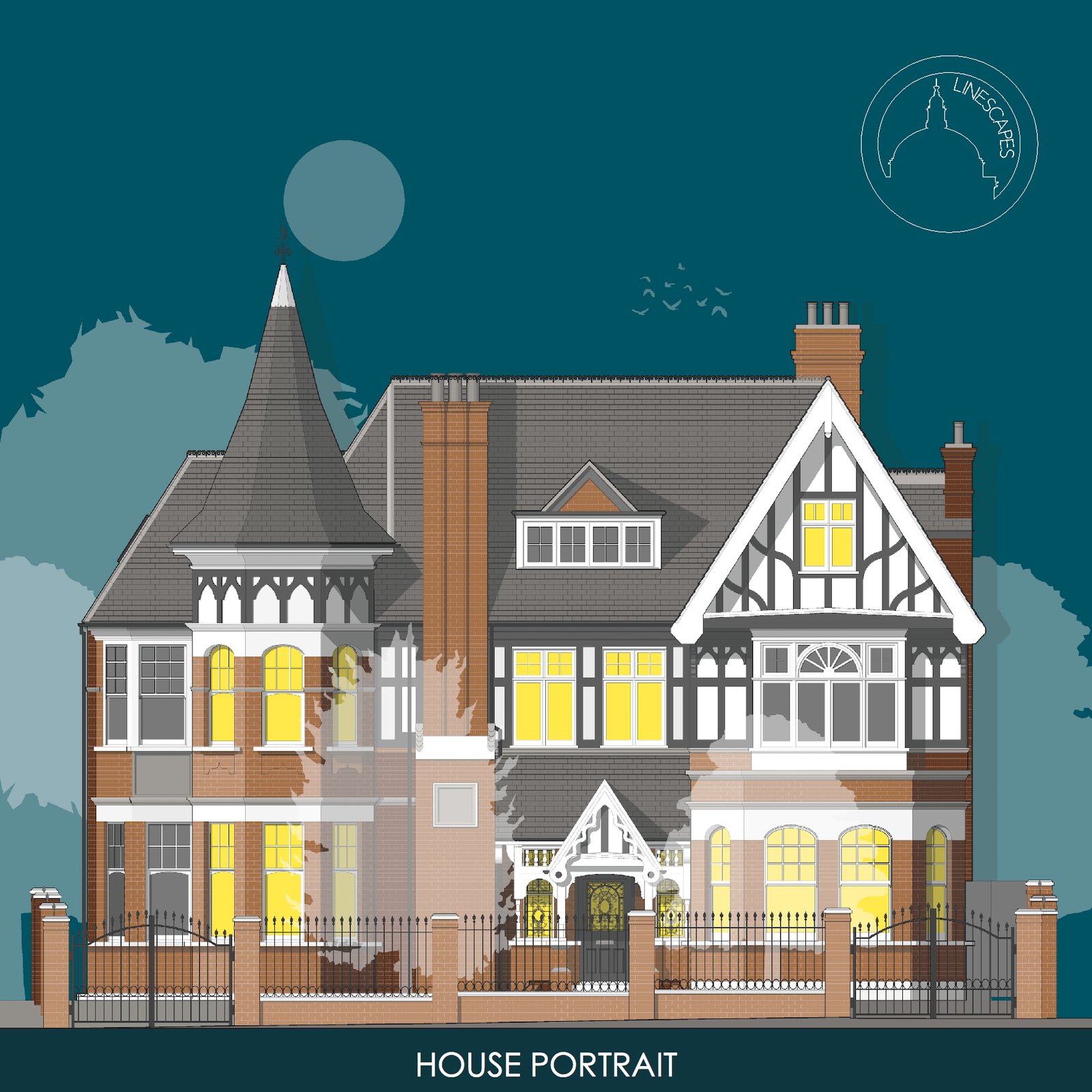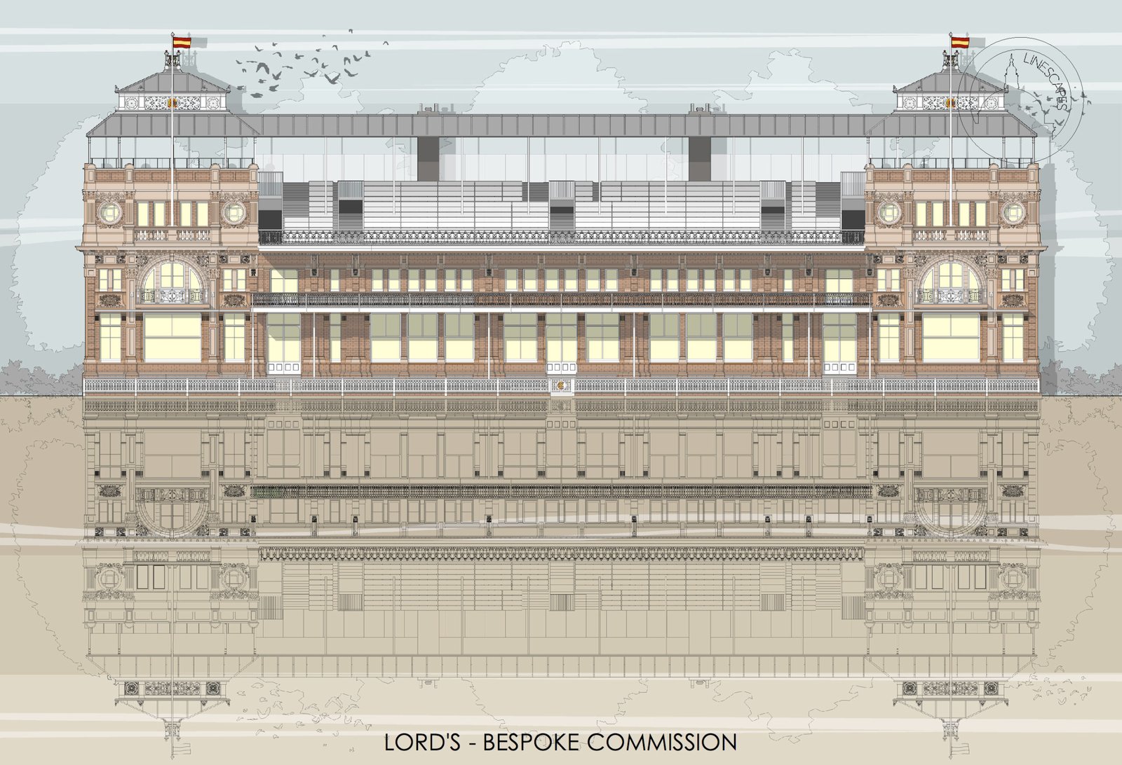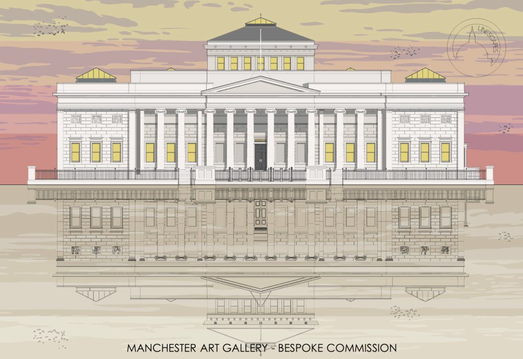 Previous bespoke commissions include creating over a hundred private house portraits, and illustrations for Sir John Soane’s Museum, Canterbury Cathedral, Chatsworth House, Harrods, Royal Opera House, Brighton Royal Pavilion and Abbey Road Studios among many others.