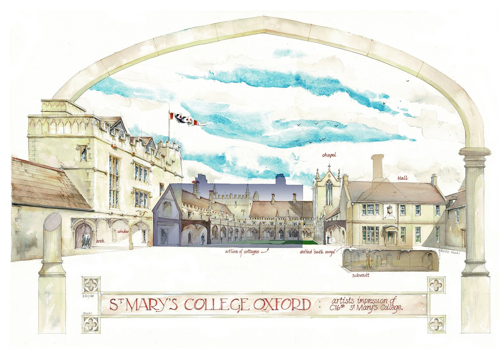 Each drawing is a hand-drawn, measured sketch perspective, or topographical sketch; coloured digitally or by hand using a variety of media.